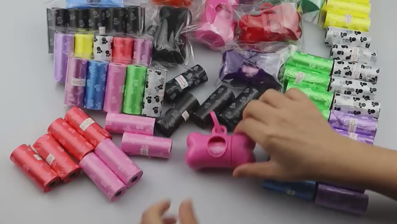 Bolsas desechables para necesidades de mascotas y dispensador con forma de hueso con clip para colgar de la correa, dispensador muy fácil de abrir y cerrar. Incluye 5 rollos, cada rollo tiene 15 bolsas, para un total de 75 bolsas y 1 hueso dispensador. Material plástico eco amigable con el ambiente, degradable. Recuerde siempre recoger las necesidades de su mascota cuando salgan de casa.