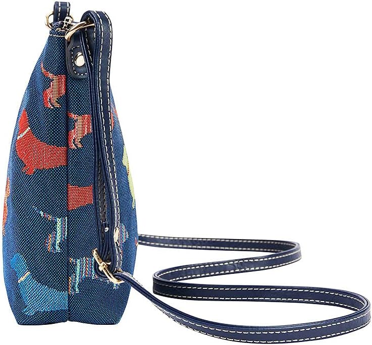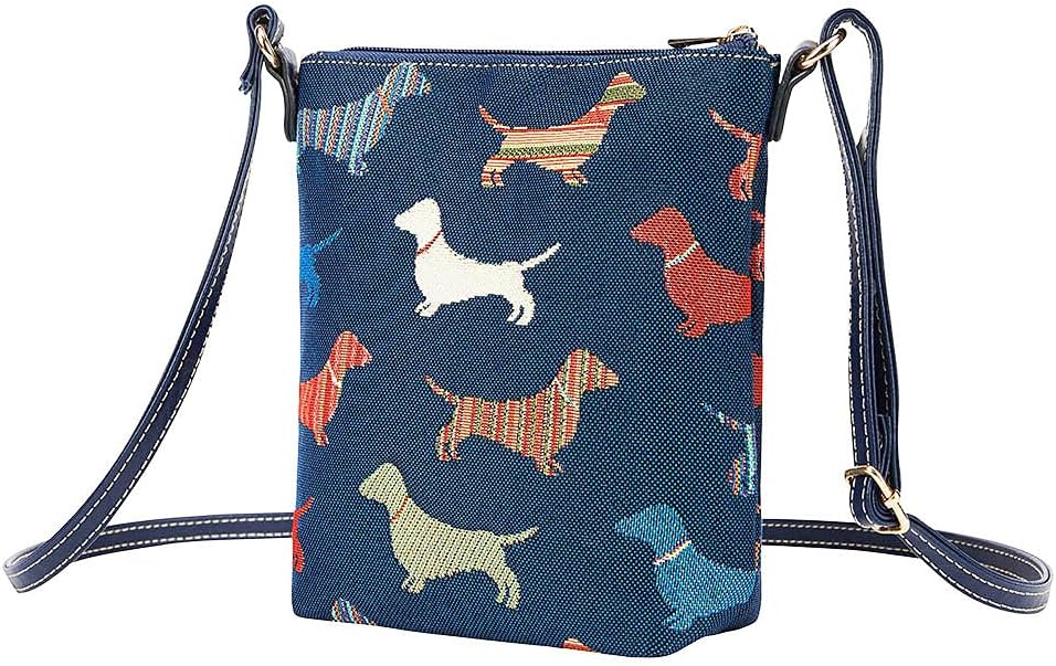 Cartera de tela con perros salchicha tejidos, estilo cross body, que según se ajuste la altura de la correa puede usarse como cartera de hombro también. Cartera de lujo para toda ocasión, trabajo, reuniones, compras, viajes. Con forro interno, adentro un bolsillo doble abierto. Cierre superior con zipper. Fino acabado, material resistente. Excelente regalo para salchilovers, Navidad, amigo secreto, amigo invisible, regalo de cumpleaños, regalo día de la amistad y el amor, Día de la Madre.