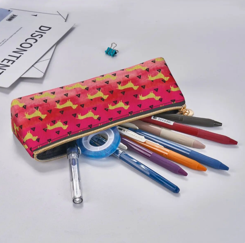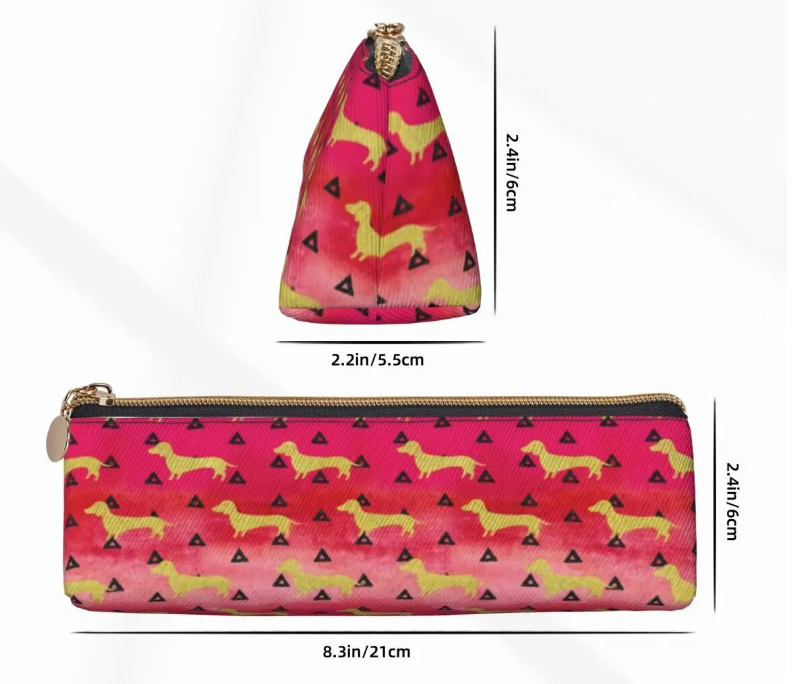¡Tu salchi se va a clases con vos! Cartuchera con impresión de figuras de perro salchicha, ideal para la escuela, el colegio, la universidad, la oficina, los viajes o el maquillaje. Material: exterior en cuero sintético pvc, interior 100% polyester, un compartimento, zipper superior. Forma triangular. Fotos con fines ilustrativos, este artículo no incluye el contenido.
