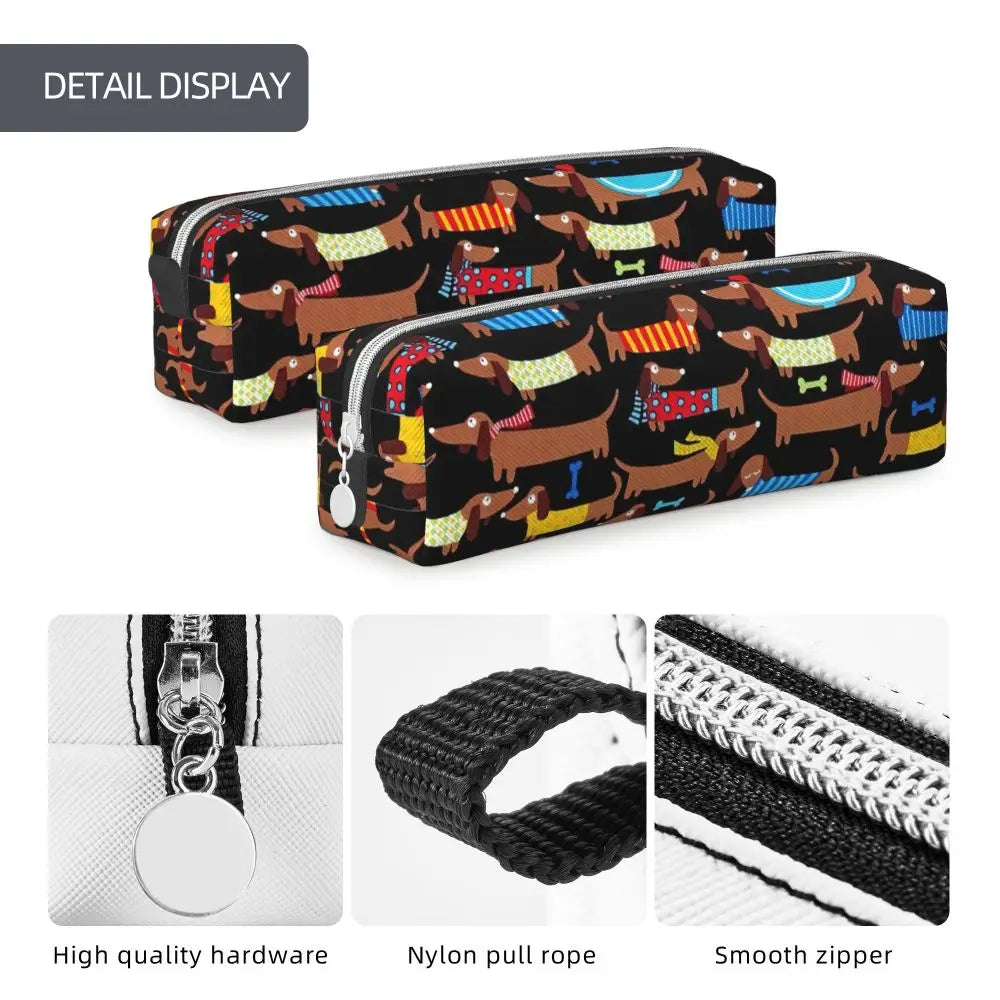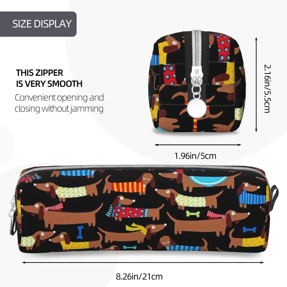 ¡Tu salchi se va a clases con vos! Cartuchera con impresión de figuras de perro salchicha, ideal para la escuela, el colegio, la universidad, la oficina, los viajes o el maquillaje. Material: exterior en cuero sintético pvc, interior 100% polyester, un compartimento, zipper superior. Forma rectangular. Fotos con fines ilustrativos, este artículo no incluye el contenido.