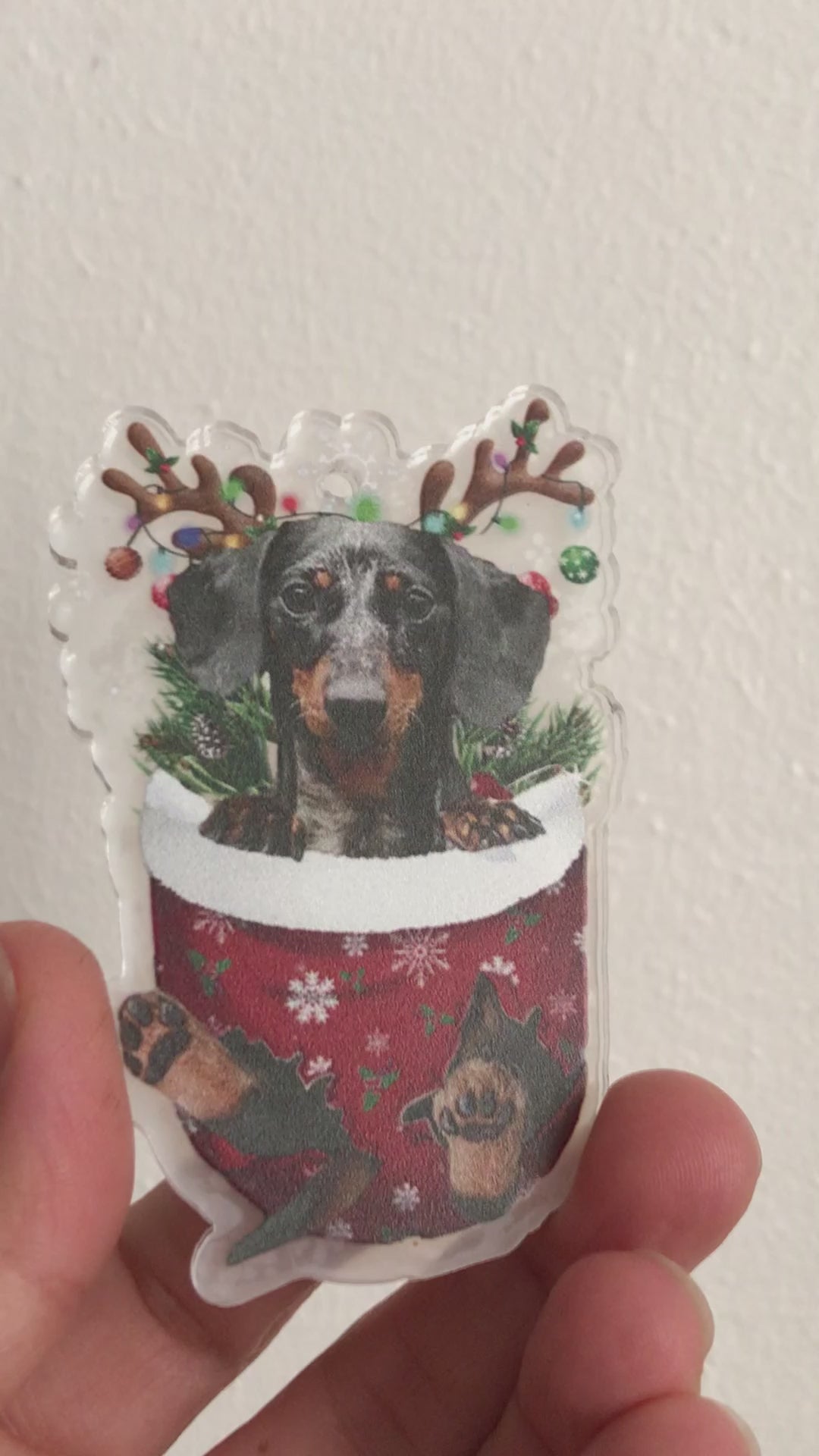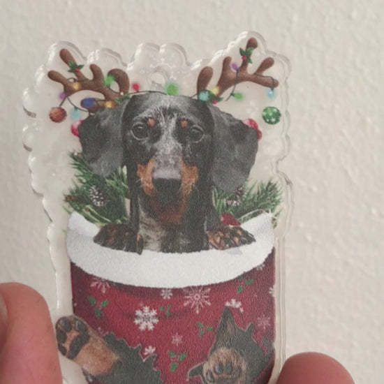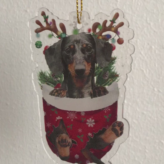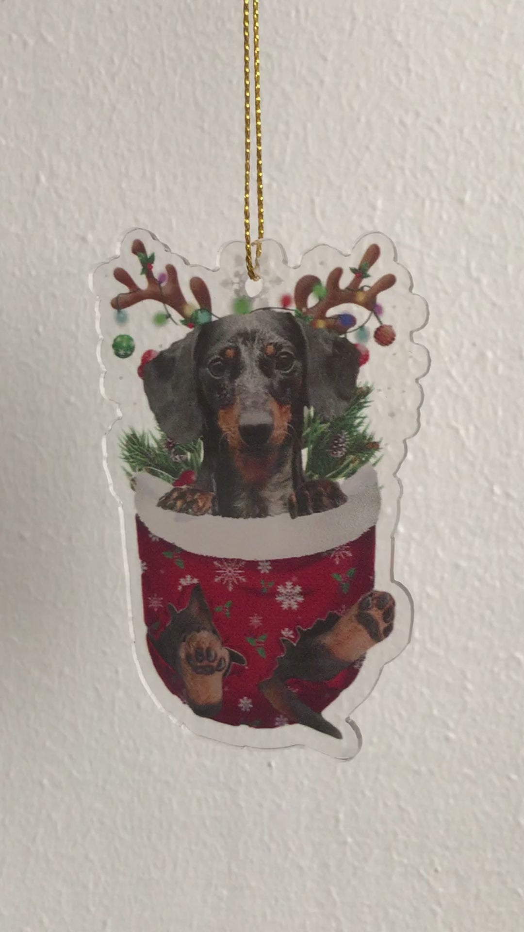 Colgante en acrílico transparente de 3 mm, con impresión de foto de perro salchicha por ambos lados, contorno troquelado según forma. Tiene una perforación arriba y cuerda dorada para colgar. Adorno para árbol de Navidad. Cada pieza trae una lámina protectora transparente que debe ser retirada antes de su uso para una imagen más colorida.