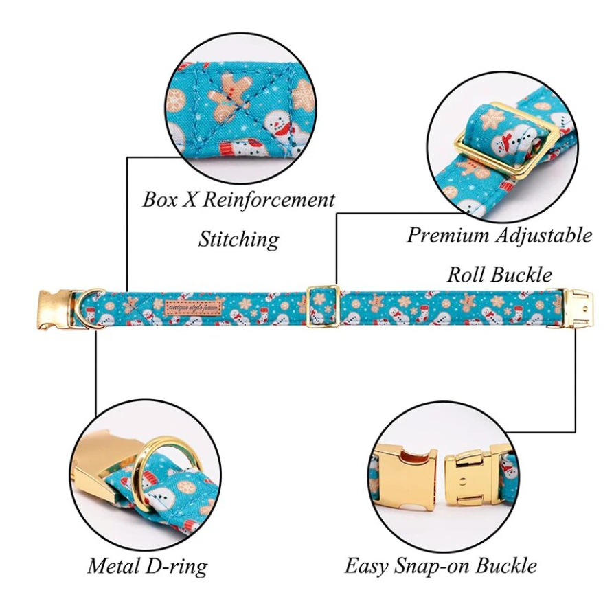 Este lindo collar 2 en 1 con corbatín navideño está hecho 100% en algodón, es ajustable y tiene hebilla dorada. Se puede usar sin el corbatín. Debe lavarse a mano.