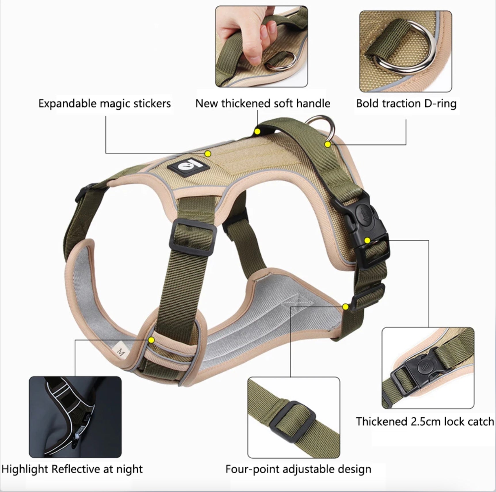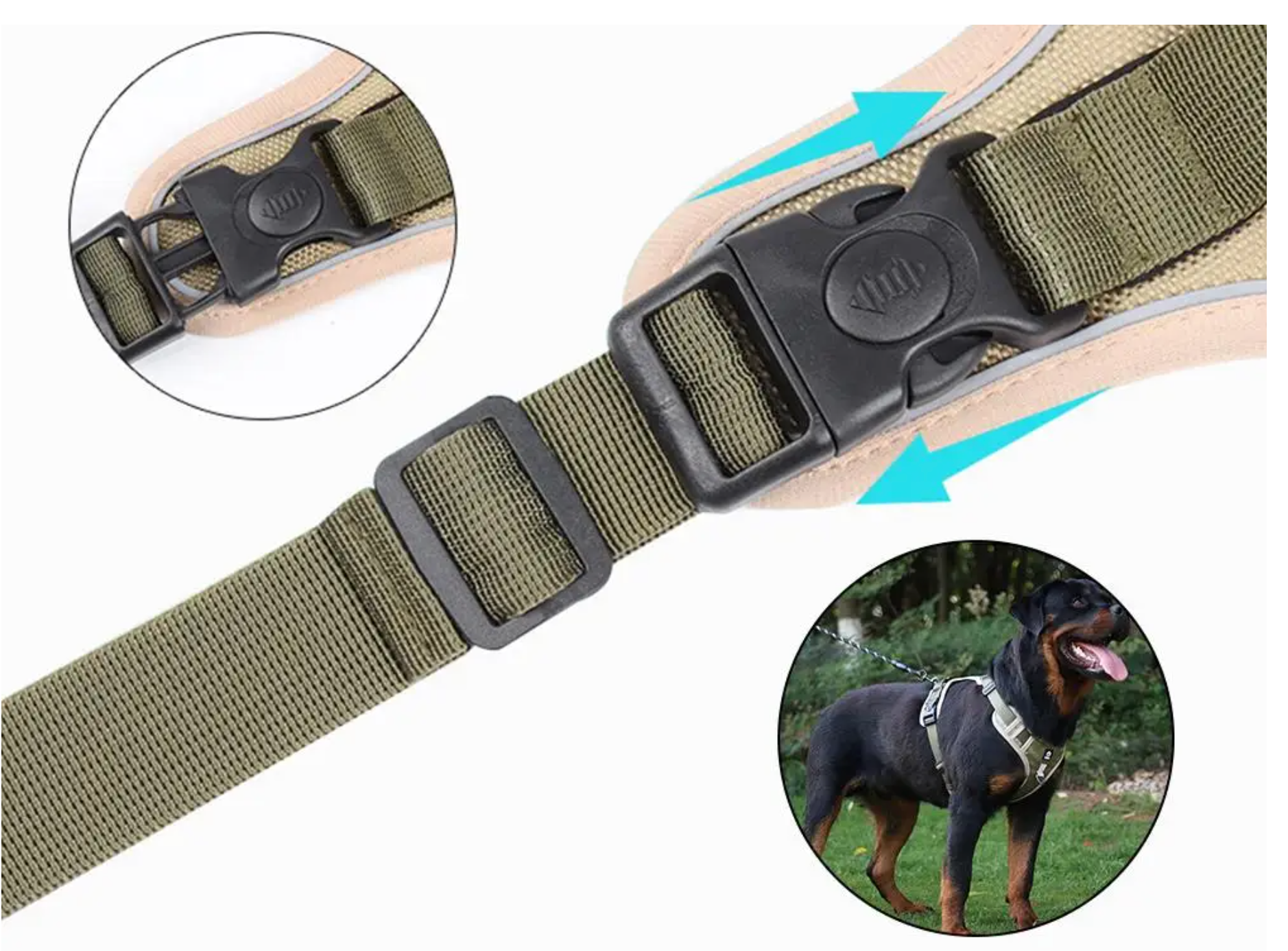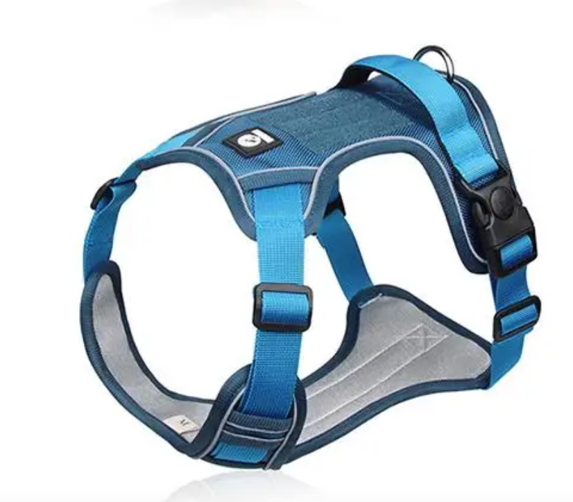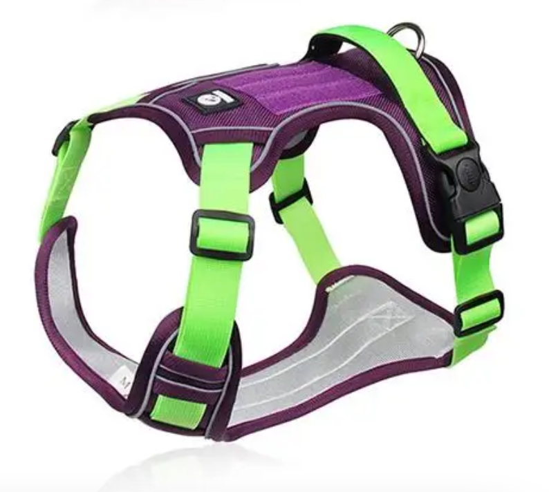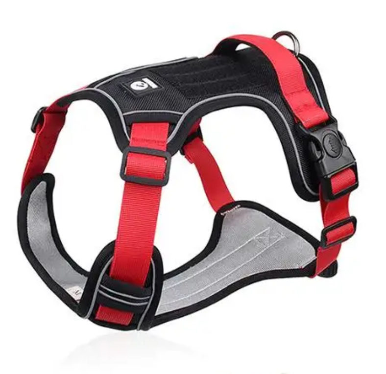 Esta pechera ajustable y reflectiva para perro le proporcionará a tu mascota seguridad y comodidad. Tiene un diseño acorde al cuerpo de la mascota y los movimientos que esta necesita hacer sin interferir con el movimiento de sus hombros lo cual es mandatorio en una buena pechera para evitar lesiones. La pechera tiene hebillas ajustables tanto adelante como atrás, para asegurar adecuadamente a la mascota y que no se salga de la pechera. Tiene además un aro en forma de "D" con refuerzos para colocar la correa. También posee una agarradera posterior para cuando se requiera sujetar la pechera con la mano. Posee 2 cierres con seguro, lo que permite cerrar los costados de la pechera y evitar que cualquier movimiento o halón las abra. Su material nylon Oxford doble hace que esta pechera sea sumamente segura, duradera y cómoda para la mascota, y su tamaño permite sujetarla desde varios puntos de una manera conveniente y a la vez sin excesos que puedan producirle a tu mascota calor o incomodidad.