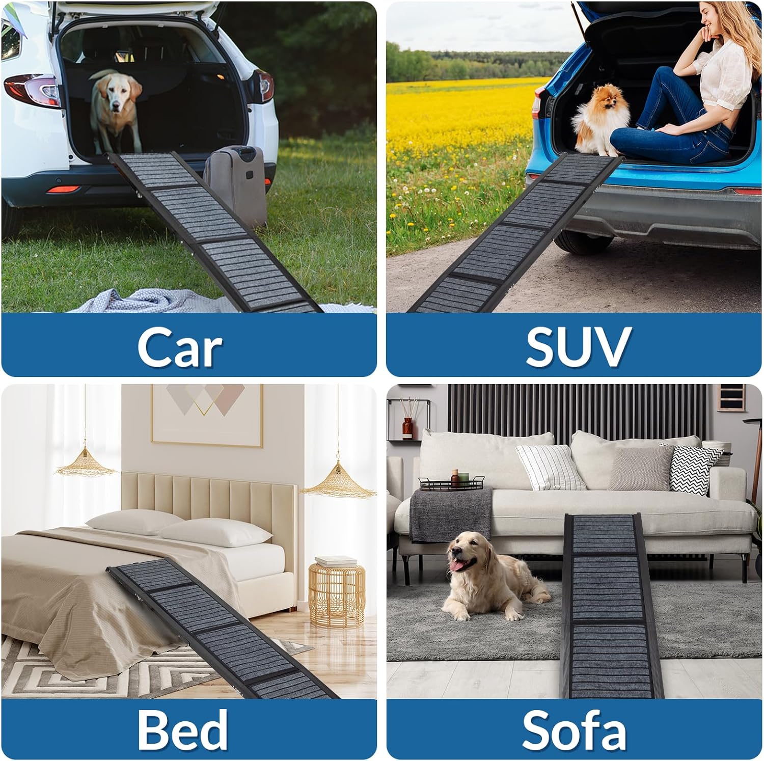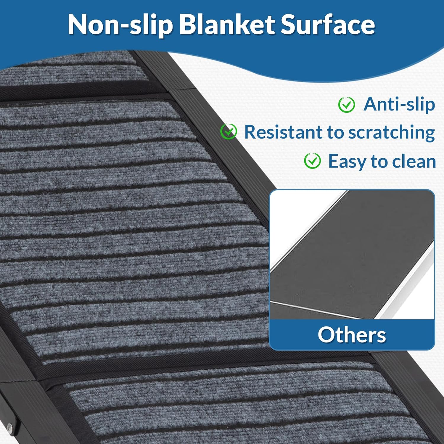 Rampa plegable para perros con superficie de alfombra antideslizante para que tu mascota pueda subir y bajar de manera segura de automóviles, vehículos SUV y camiones de menos de 29 pulgadas de alto, así como de camas y sofás. Ideal para todo tamaño de perros y gatos. Material: metal y alfombra antideslizante que evita el deslizamiento y protege los cojinetes (almohadillas) de las mascotas.