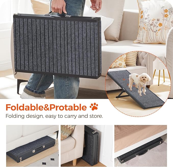 Rampa plegable para perros con superficie de alfombra antideslizante para que tu mascota pueda subir y bajar de manera segura de camas, sofás y automóviles. Ajustable a 5 alturas (desde 9.8" a 24"). Es plegable y compacta. Ideal para perros medianos y pequeños, así como gatos. Material: metal y alfombra antideslizante que evita el deslizamiento y protege los cojinetes (almohadillas) de las mascotas.